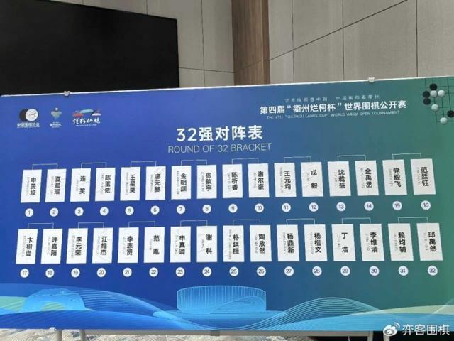 直播吧4月14日讯 根据“弈客围棋”消息,4月15日12:30,第四届“衢州烂柯杯”世界围棋公开赛32强赛将在衢州大花园酒店举行,32强对决出炉。