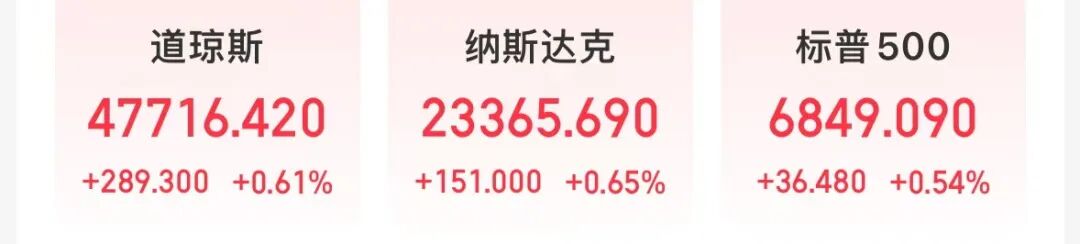 当地时间11月28日(周五),美股三大股指集体上涨。道指涨0.61%,报47716.42点;纳指涨0.65%,报23365.69点;标普500指数涨0.54%,报6849.09点。